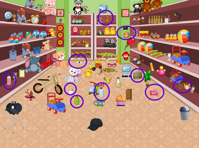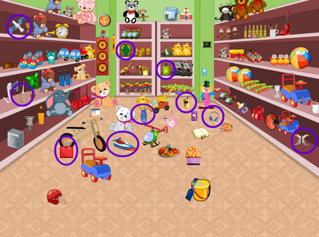Toys Shop-Hidden Objects is another type of new hidden object game developed by hiddnogames.com. Do you love to find hidden objects? Again you have chance to showing your object finding talent. As you know here your task is finding all the hidden objects in this toys room pictures. But be careful because for your each 5 wrong click you will lose your 10 second from important game time. It�s not that easy, but fun good luck. |